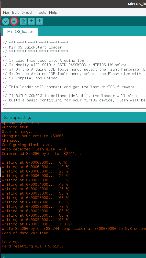 The easiest way to get started with MirTOS on your device, is to load it with the MirTOS loader, which will install the firmware with a minimal configuration.
