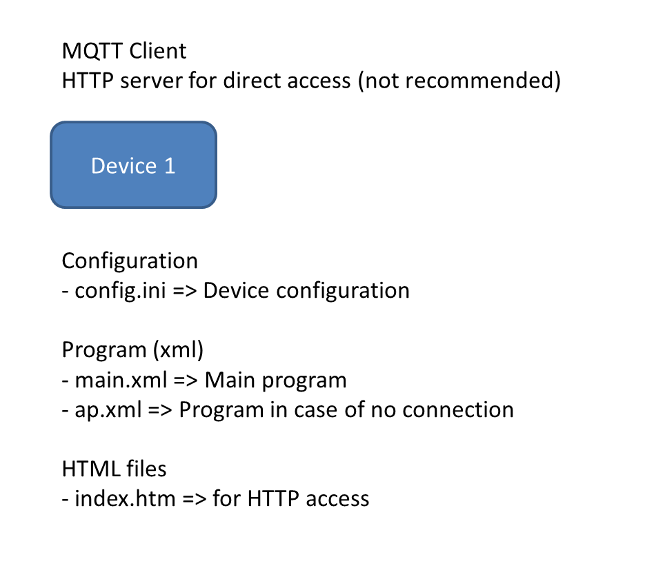 Each device should be able to perform its own job and to communicate to other devices and also to the central system. The device has a mini file system which can hold different files. Some files are otional, some are mandatory