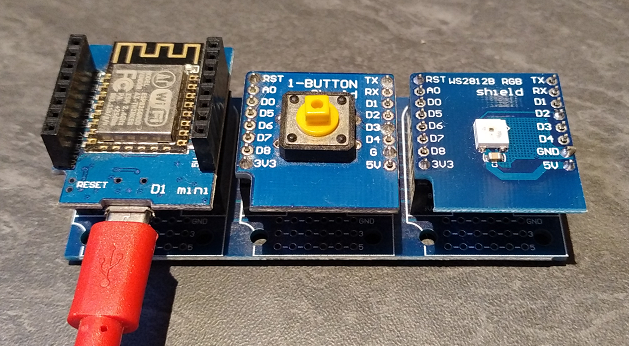 First example will use a standard WeMos D1 module with two shields (button and LED). Same example can be used with Button on Relay shield.