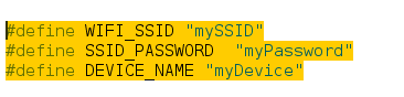 2) Modifiy the code to specify your Wifi SSID and Wifi password, the name you would like to give for your device, and the device type: