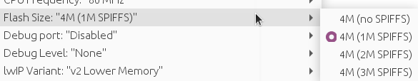 4) Select the partition (menu Tools) with the smalest SPIFFS size