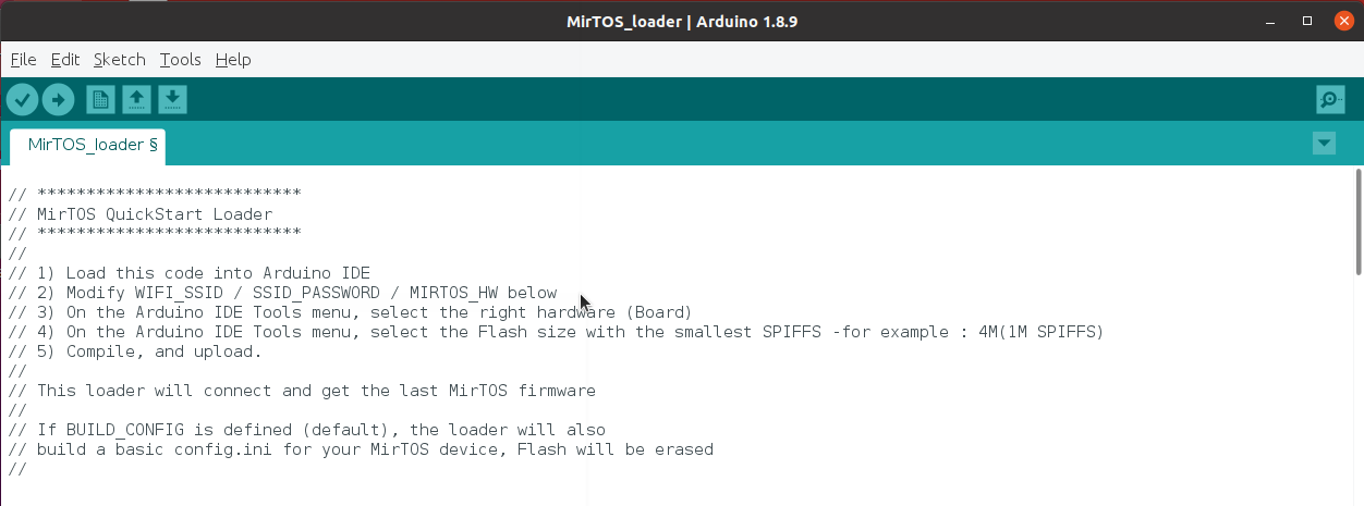 1) First, download the short loader code at http://www.mirtos.org/quickstart/MirTOS_loader.ino and open it on the Arduino IDE